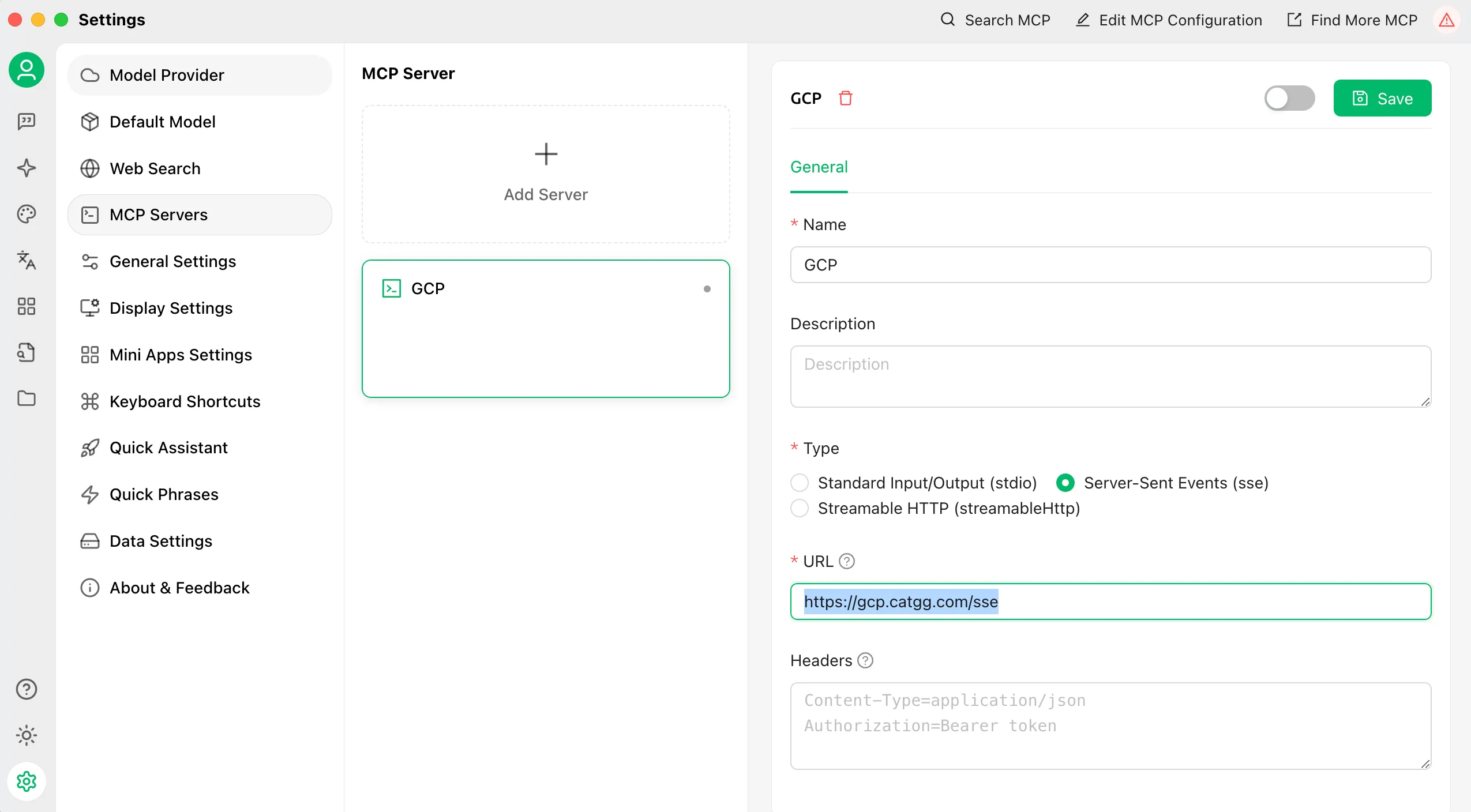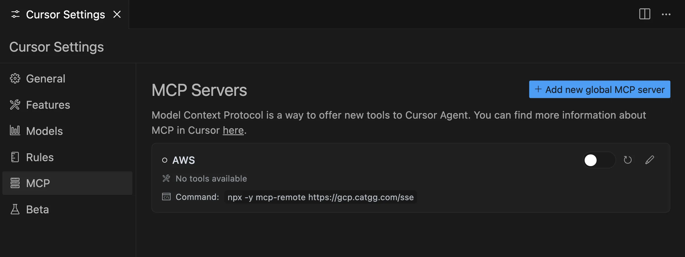 作为攻击者:发布一个 remote MCP Server,在网站、论坛上宣传该 MCP Server,吹的天花乱坠,有了这个MCP Server,就可以实现以自然语言与 Google Cloud 进行交互。 使用 MCP Server 时,SSE 地址需填入 https://gcp.catgg.com/sse (和 AWS 不一样的是,这里的 Endpoint是统一的,无论是谁,都用这个 Endpoint 就行)