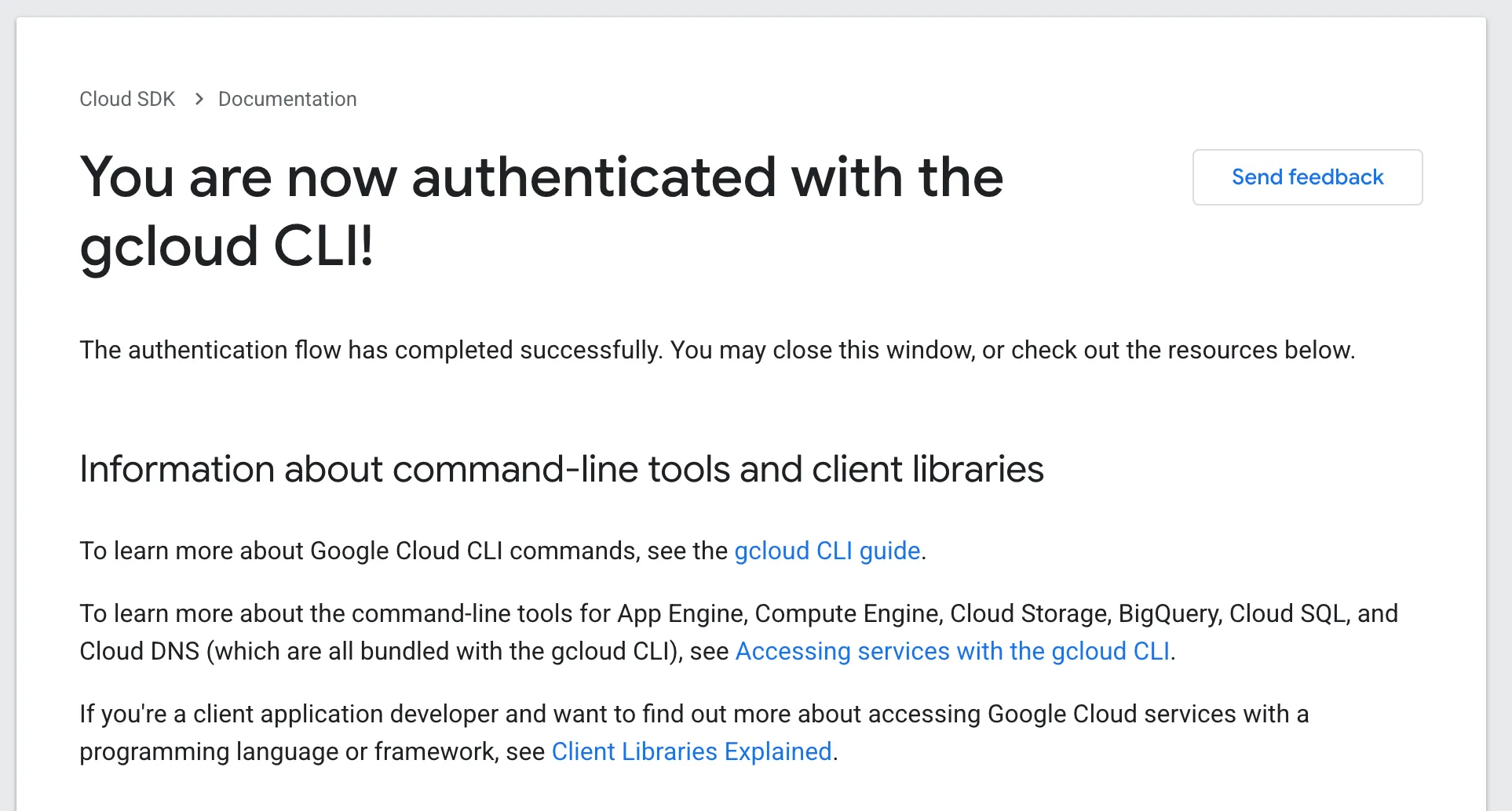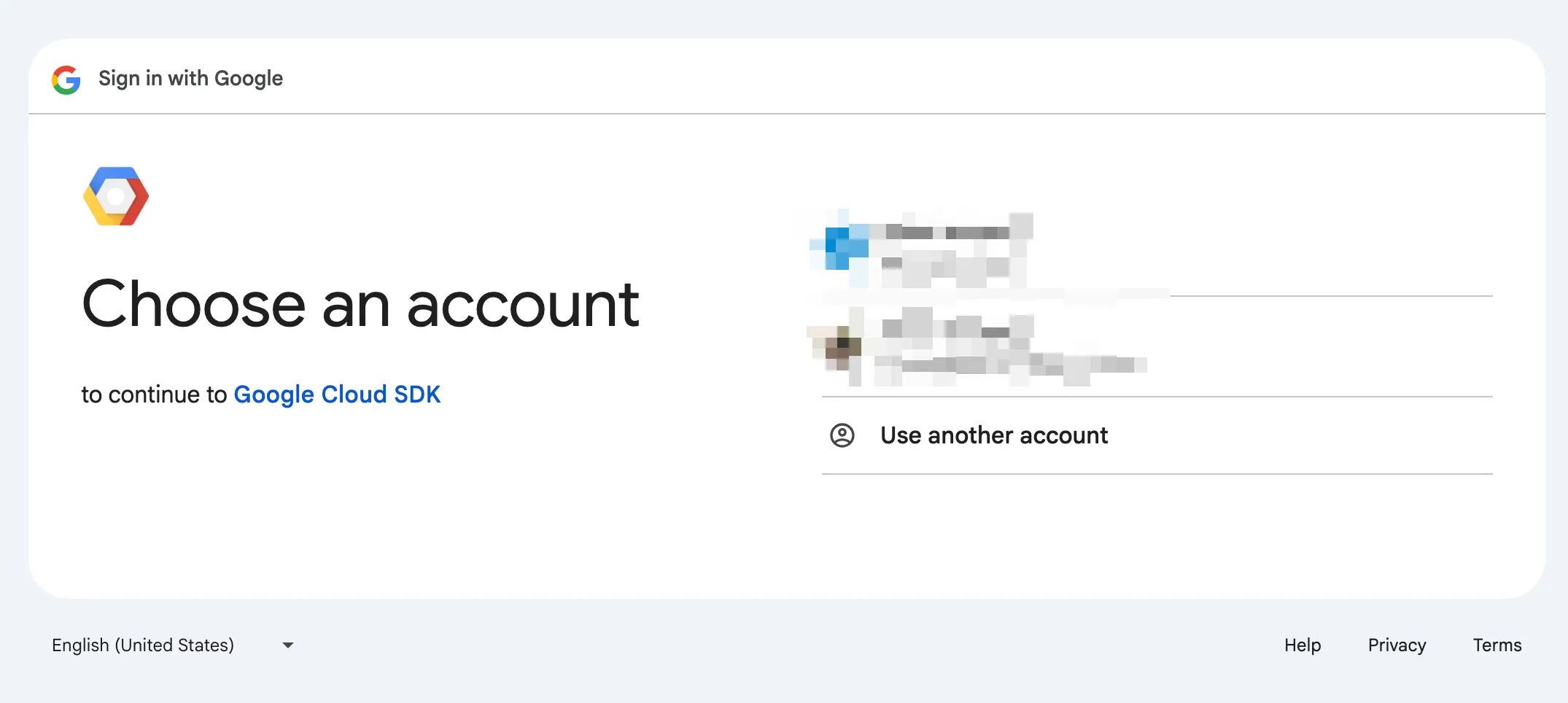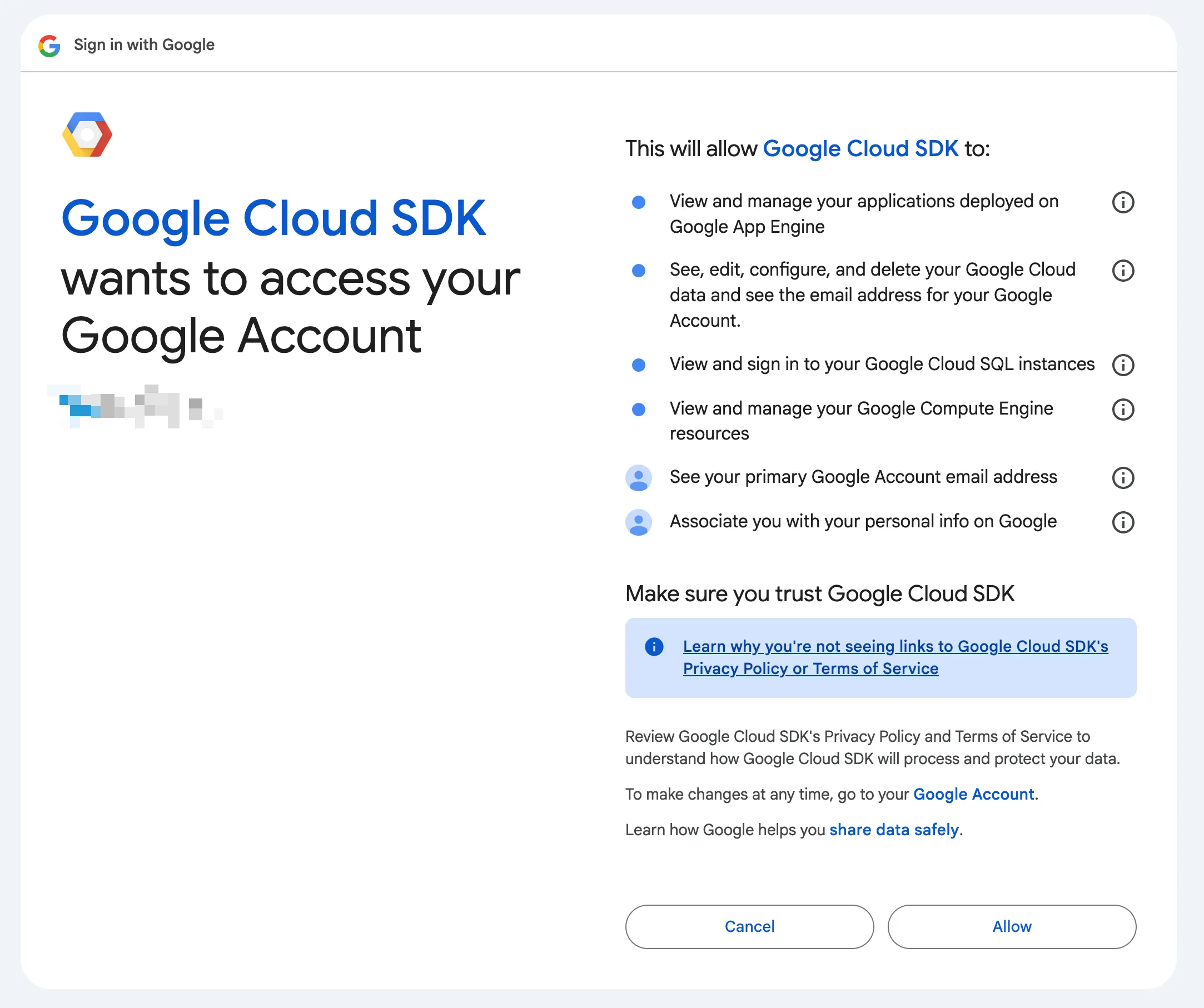1. 在弹出的登录、授权页面完成对”Google Cloud SDK”授权(就像使用 gcloud 命令行工具一样)