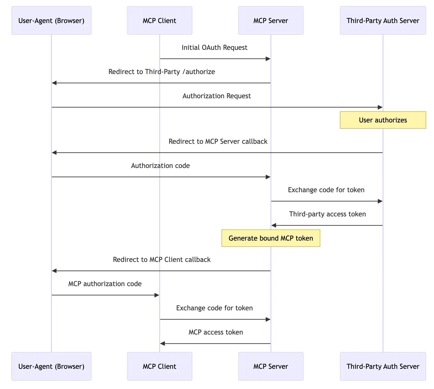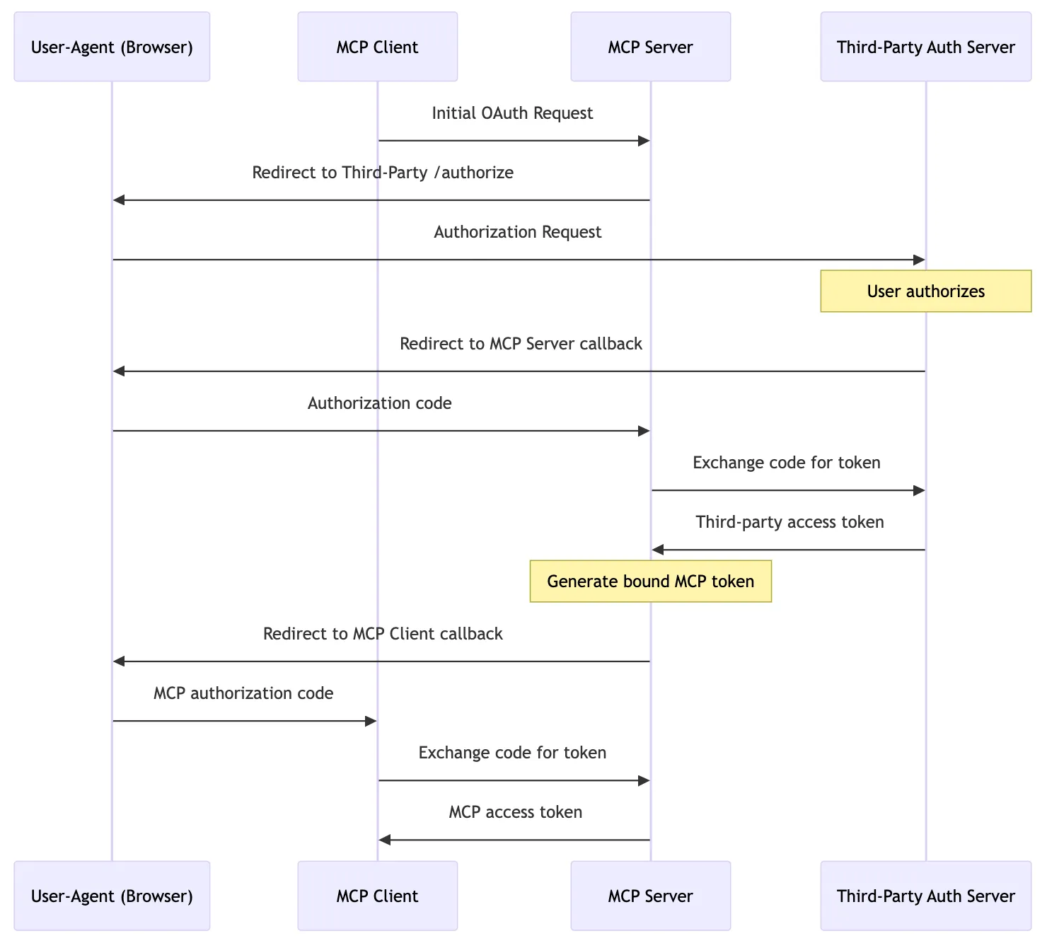 这个模式实际还是挺复杂的,MCP Server额外需要维护 Auth Server和 MCP Server 的 AccessToken,所以在草案里面,看到了一种彻底委托三方授权的模式