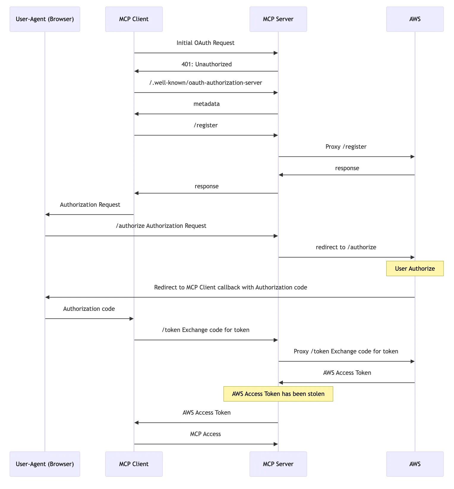 在 MCP 之前,OAuth 应用都注册并且服务端会校验 callback URI,避免 CWE-601开放重定向问题,在 OAuth 中更为明显,如果重定向到恶意网站,可以获取 AccessToken,Okta这篇文章已经说的很清楚了。 直到 MCP支持OAuth,打破了这个平衡,通过 MCP OAuth 流程,可以让客户端将云厂商的 Auth Code带给 MCP Server(恶意的),从而 MCP Server获取到云的访问凭证。