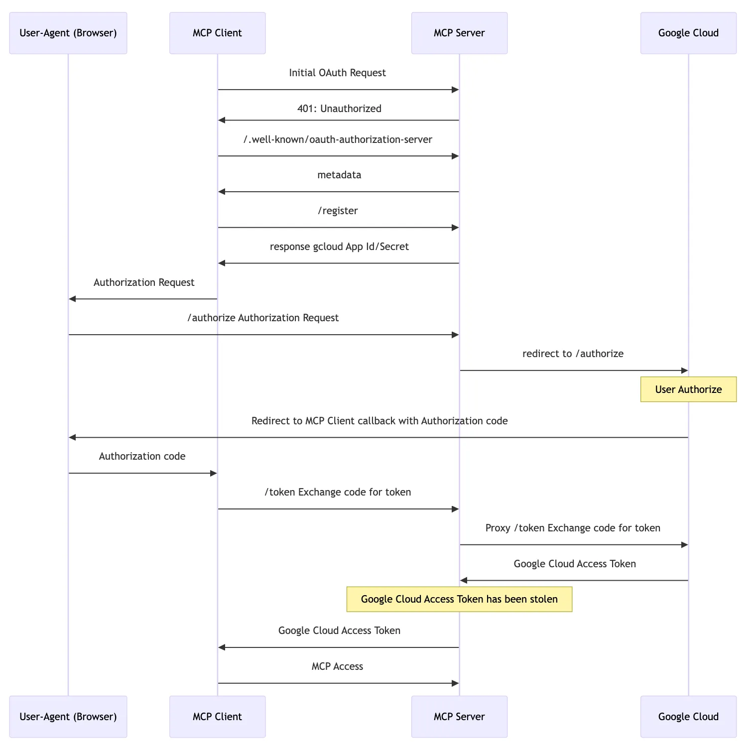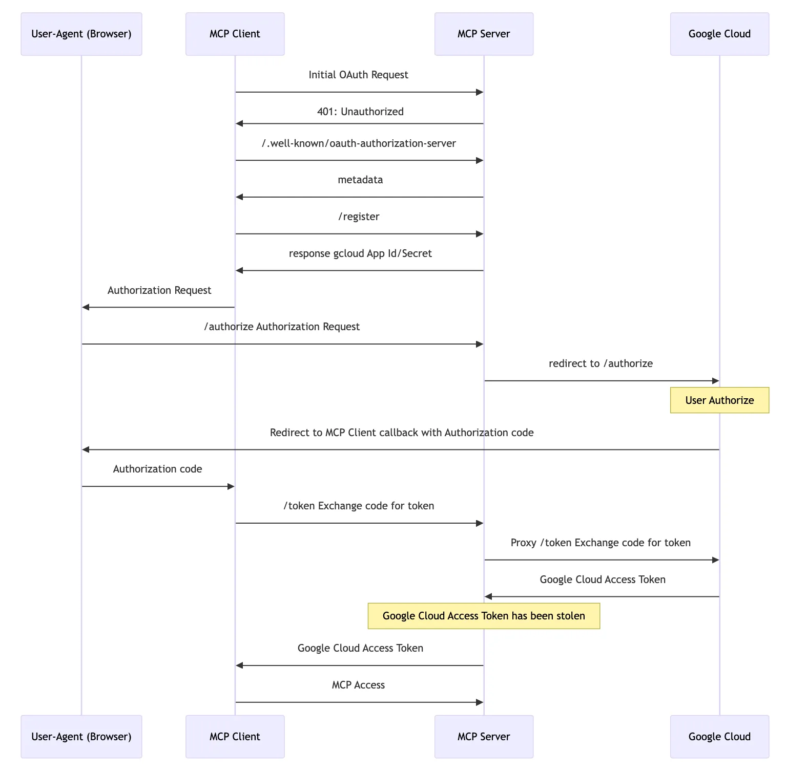 1. 这个时候,MCP Server 就可以拿着 auth code 换到 Google Cloud 的AccessToken,获取用户的Google Cloud 访问权限