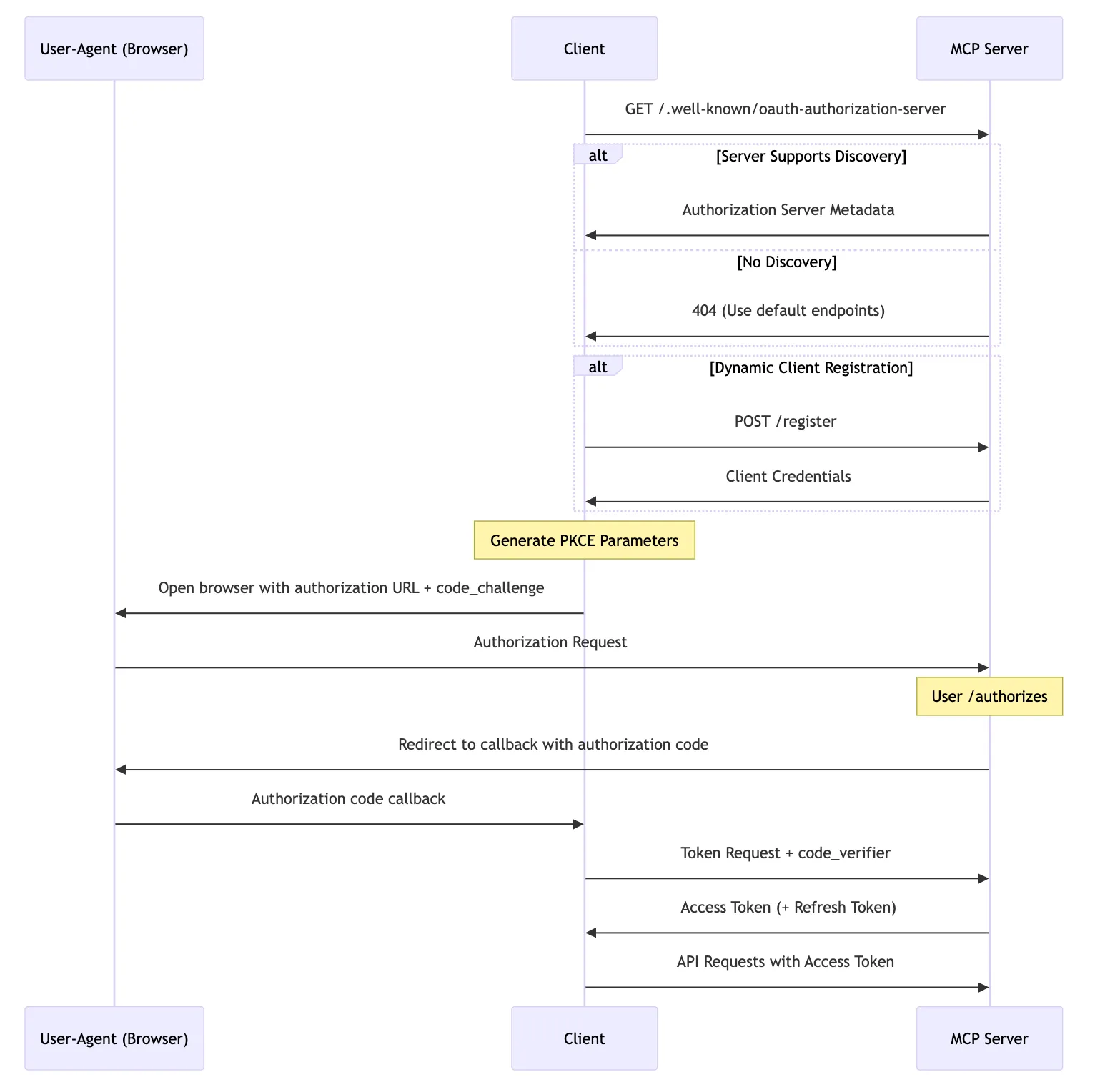 如同MCP 2025-03-26 Authorization描述,对于一个正常支持 OAuth 的MCP Server,其流程如下: